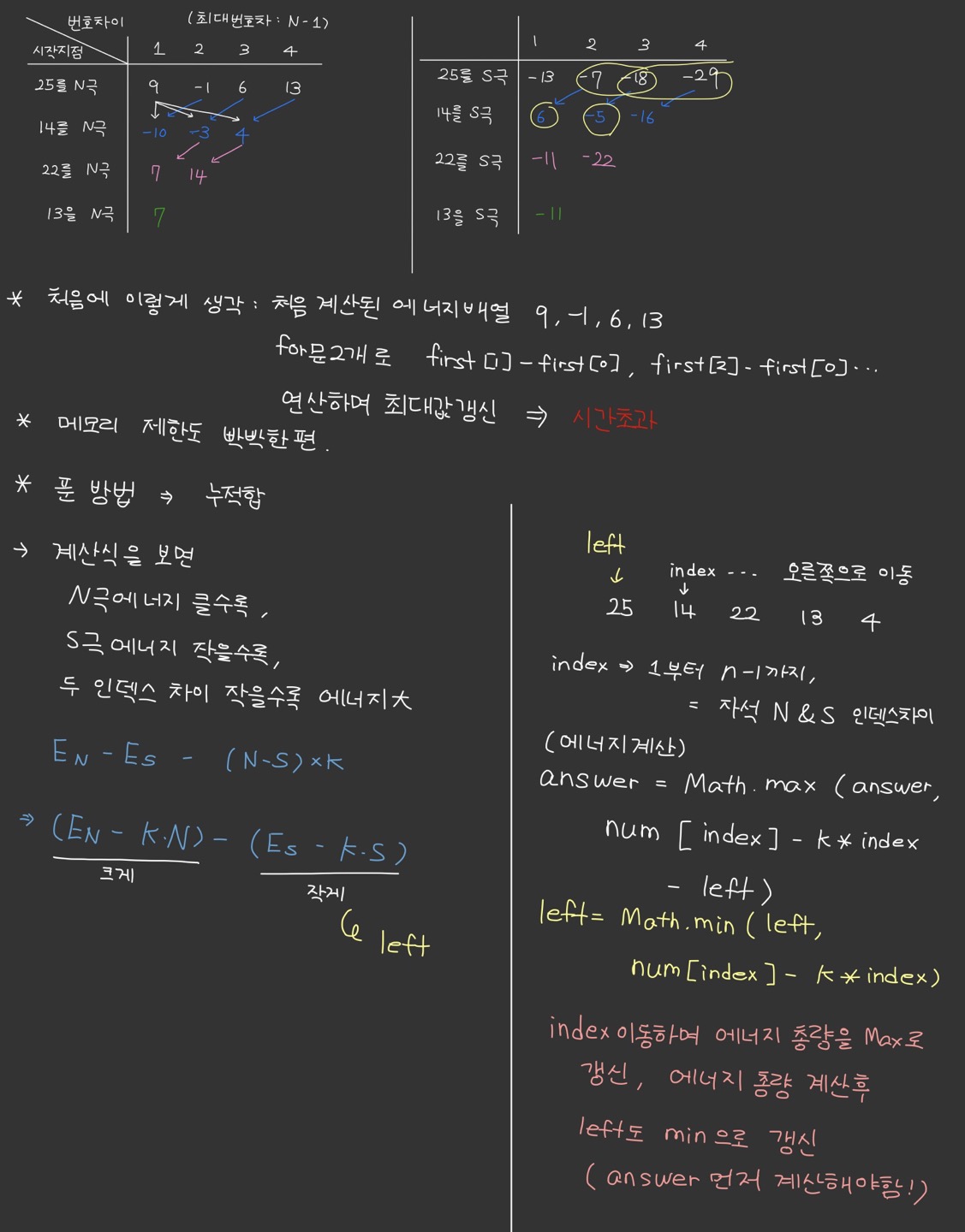En - Es - (N index - S index) * K = En - Es - (N index * K - S index * K) = En - Es - N index * K + S index * K = (En - N index * K) - (Es - S index * K)🧲 에너지를 최대로 만들 수 있는 값을 계산하면 된다. (여기서 착각한게, 절대값의 최대를 계산하는게 아니다. -건 +건 다양한 변화량들 중 가장 큰 값을 찾는 문제이다. ) 이 에너지에는 아래와 같은 요소가 영향을 미친다.