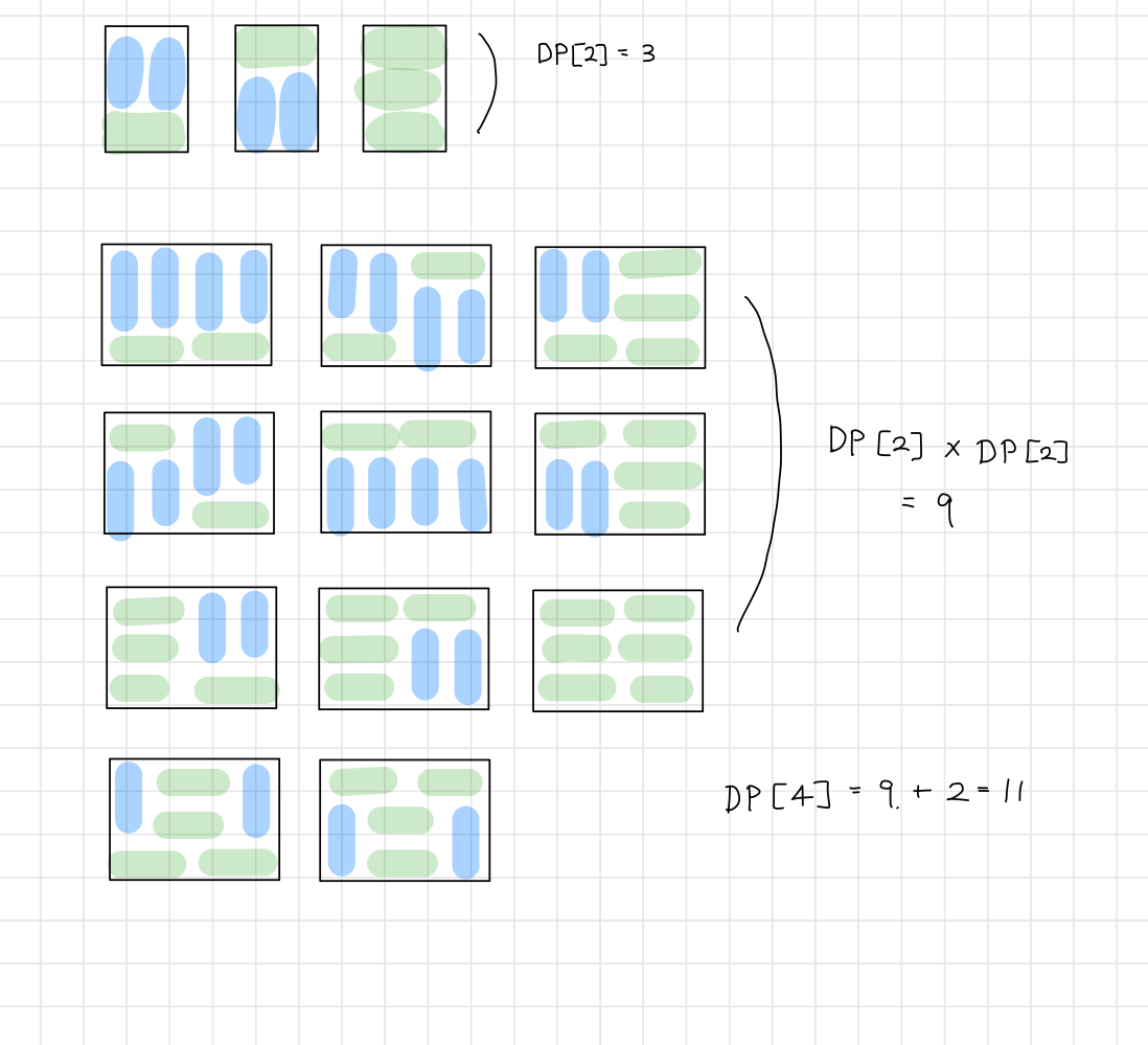 그러므로 이 순서가 바뀐 걸 염두해두고 한번 더 [ 4칸짜리 유니크 타일 2개 X 나머지 2칸을 채우기 위한 DP[2] 값 ] 계산해준 뒤 더한다.
