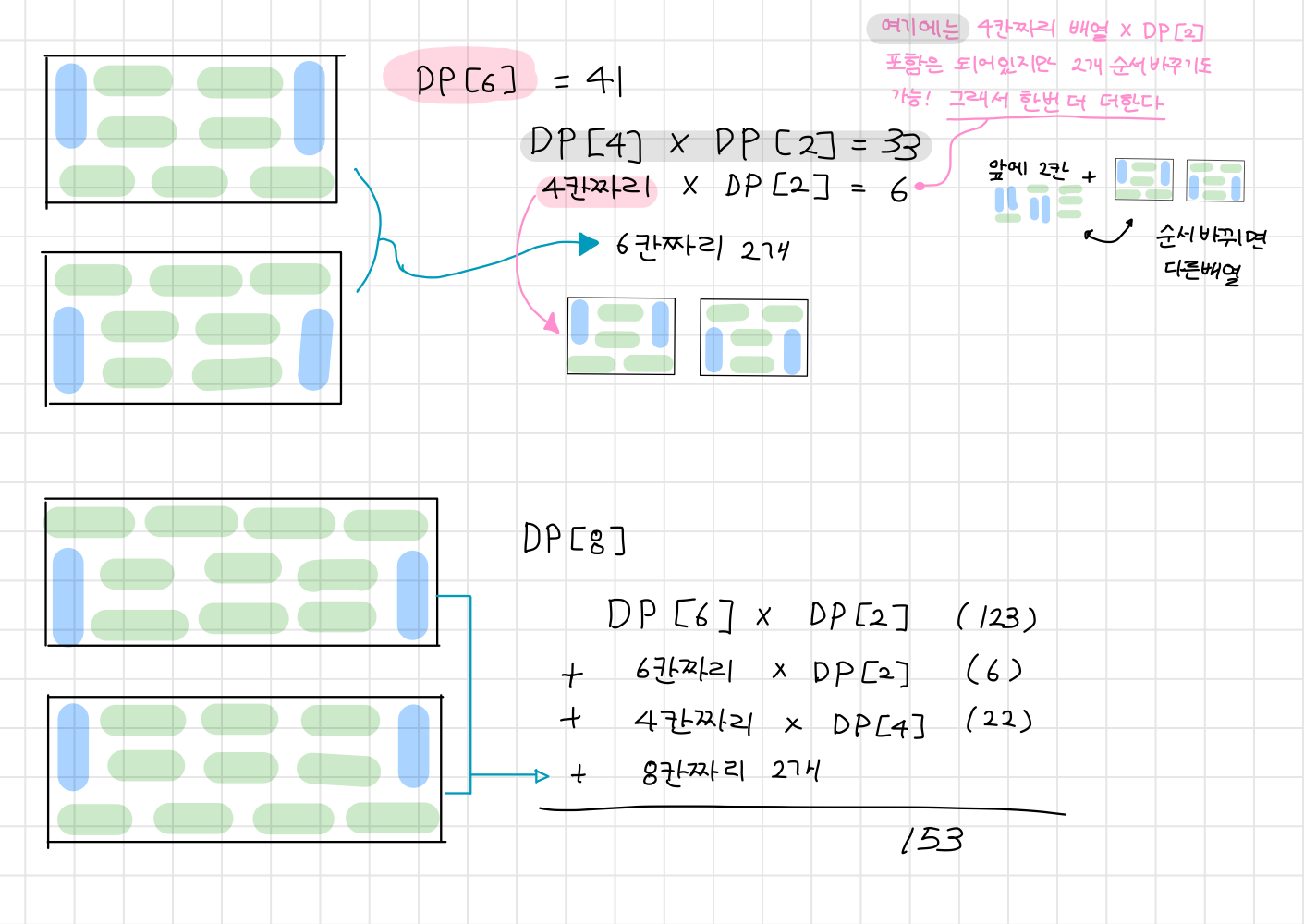 🧩 그리고 그림에도 설명을 써놨지만, 이미 DP[4]에서 4칸 조합을 다 구해놨었다. 하지만 이 타일들 조합은 배치 순서가 바뀌면 다른 조합이므로 4칸짜리를 앞에 두고 뒤에 2칸짜리를 넣느냐, 아니면 2칸짜리를 앞에 두느냐가 다르다.