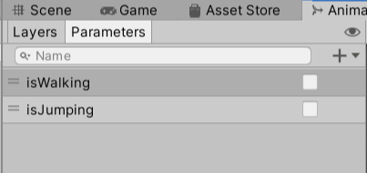 애니메이션 컨트롤러 내에 정의된 변수로 스크립트 상에서 값의 할당 / 접근이 가능하다. 아래 사진의 2가지 값은 전부 Bool타입의 변수로 현재 걷고 있는가?와 점프중인가? 이렇게 2가지가 있다.