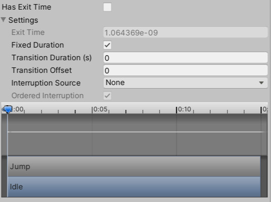 예시로 가져온 jump -> idle transition Transition은 애니메이션 상태를 옮겨가는 통로를 의미한다. Animator창에서 화살표(transition)을 클릭하면 inspector창에 위와 같은 여러 세팅들이 나온다. 하나씩 차례대로 찾아봤다.
