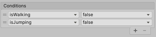 이 transition이 언제 일어나는지 조건을 설정할 수 있다. 아래 이미지는 jump->idle이므로 walking과 jumping불리언 변수 모두가 false여야한다.
