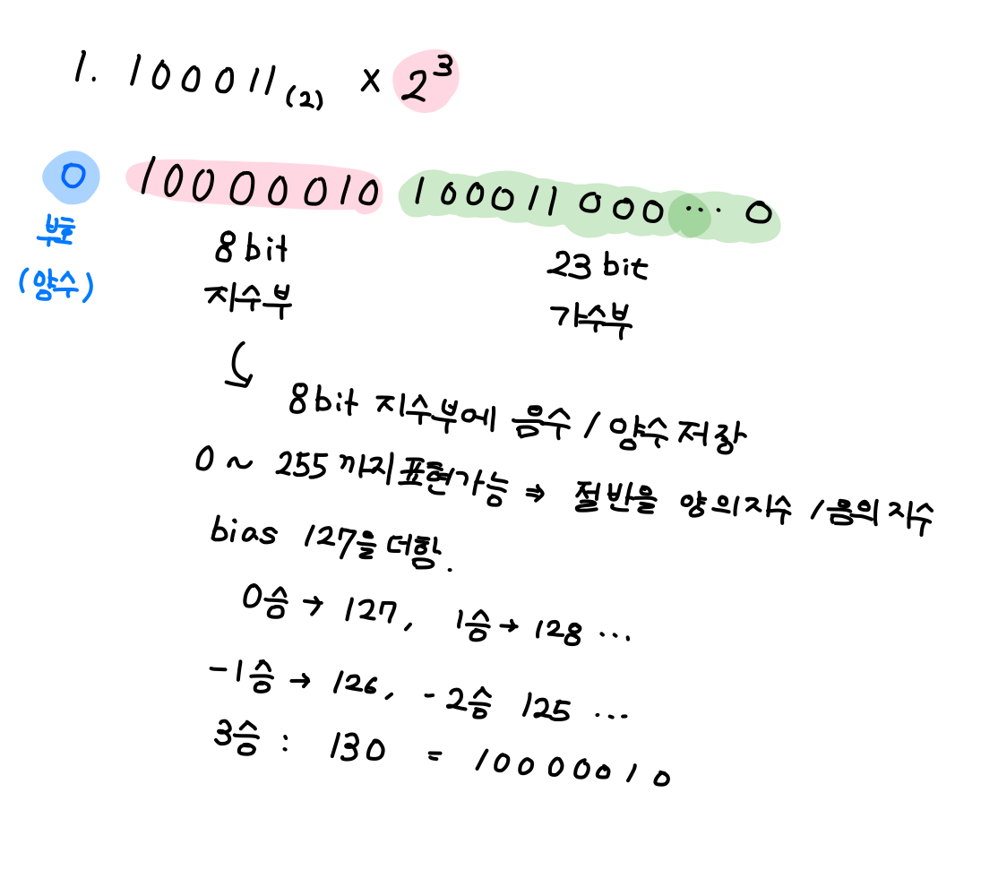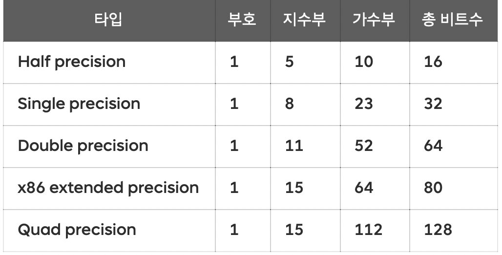 - 부동 소수점의 경우 유효숫자를 사용한 곱셈 형태로 표현