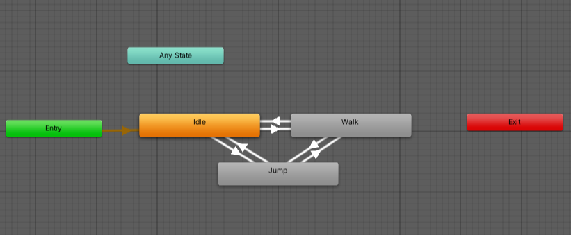 현재 사용한 에셋에는 idle(대기상태), walk, jump이렇게 3가지의 애니메이션이 번갈아 동작된다. 가만히 있다가 점프 / 걷기가 가능하고 걷다가 점프도 가능해서 삼각형모양으로 transition이 그려진다.