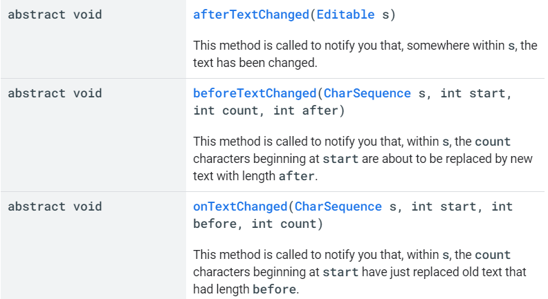 아래 표는 TextWatcher에 정의되어 있는 함수이다.