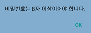 if((id_input.length() < 8) || (pw_input.length() < 8)) { Toast.makeText(getApplicationContext(), "ID 및 비밀번호는 8자이상이어야 합니다.", Toast.LENGTH_SHORT).show(); }