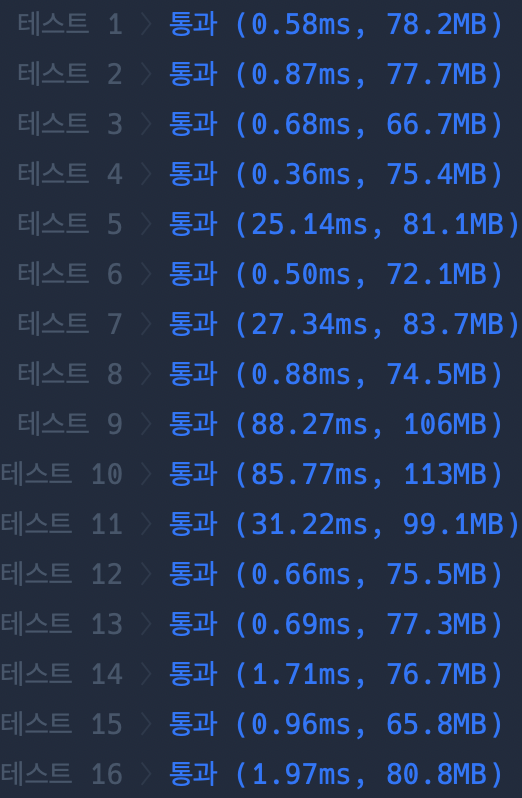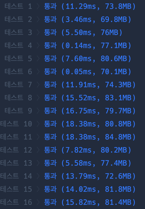 🔢 프로그래머스에서 테스트 케이스를 공개하지는 않는데, 몇 번 돌려보니 5, 6, 9, 10, 11 이 쪽이 데이터가 많은 테스트인 것 같았다(처음에 여기서 시간초과 났음)
