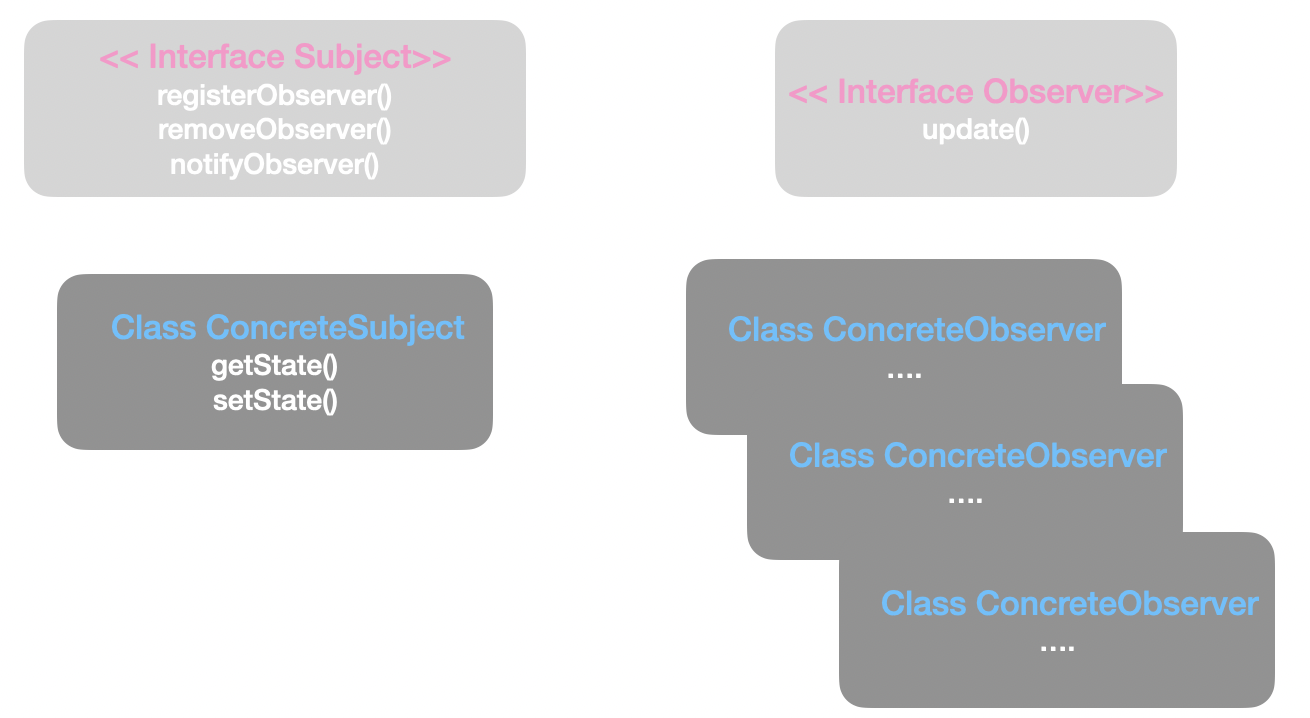 주제는 Subject interfcae, 옵저버는 Observer interface