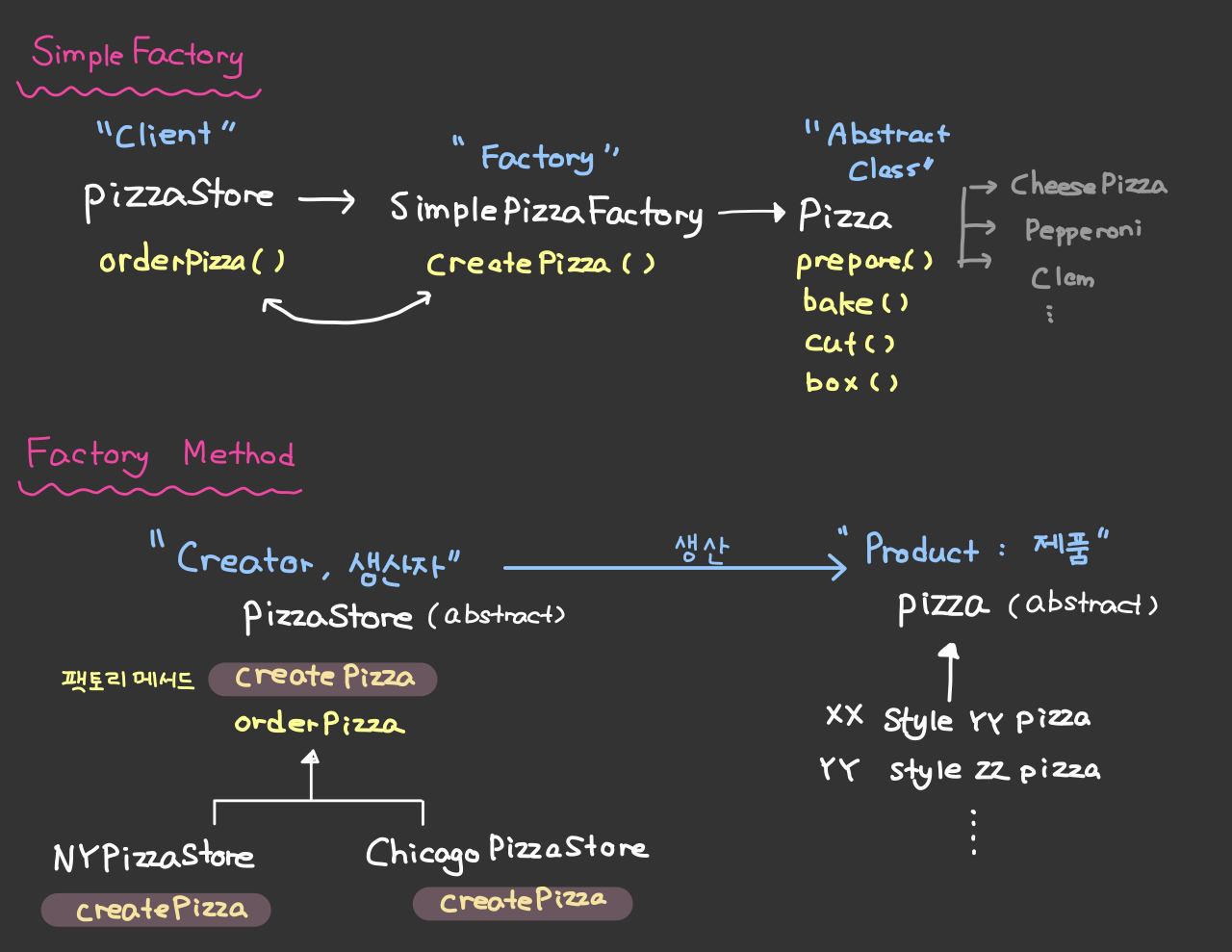 Pizza orderPizza(String type) { Pizza pizza; // 이 부분이 피자가 바뀔 때마다 코드를 계속 추가하고 삭제해야 하는 것이 문제이다. // ( 인스턴스를 만드는 구상 클래스 선택하는 부분 ) // 이 부분을 따로 빼두자(팩토리) if (type.equals("cheese")) { pizza = new CheezePizza(); } else if (type.equals("pepperoni") { pizza = new PepperoniPizza(); } else if (type.equals("clam")) { pizza = new ClamPizza(); } else if (type.equals("veggie")) { pizza = new VeggiePizza(); } // 이 아래부분은 바뀌지 않음 pizza.prepare(); pizza.bake(); pizza.cut(); pizza.box(); return pizza; }