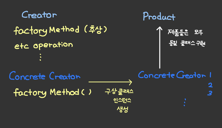 - 인터페이스만 제공, 실제 팩토리 메소드를 구현하고 객체 인스턴스 만드는 일은 서브 클래스에서만 할 수 있음