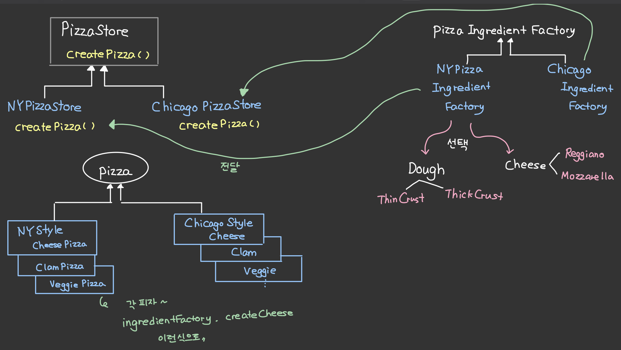 PizzaIngredientFactory ingredientFactory = new NyPizzaIngredientFactory 넣어주기🍎 클라이언트 코드와 인스턴스를 만들어야 할 구상 클래스를 분리 🍏 새로운 제품을 추가 시 인터페이스 변경이 일어난다.