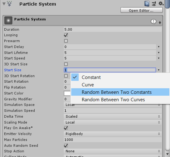 start size에 저렇게 2가지 값을 입력하게끔 나옵니다. 저 2개의 상수 사이 랜덤값으로 입자의 사이즈를 지정해줍니다