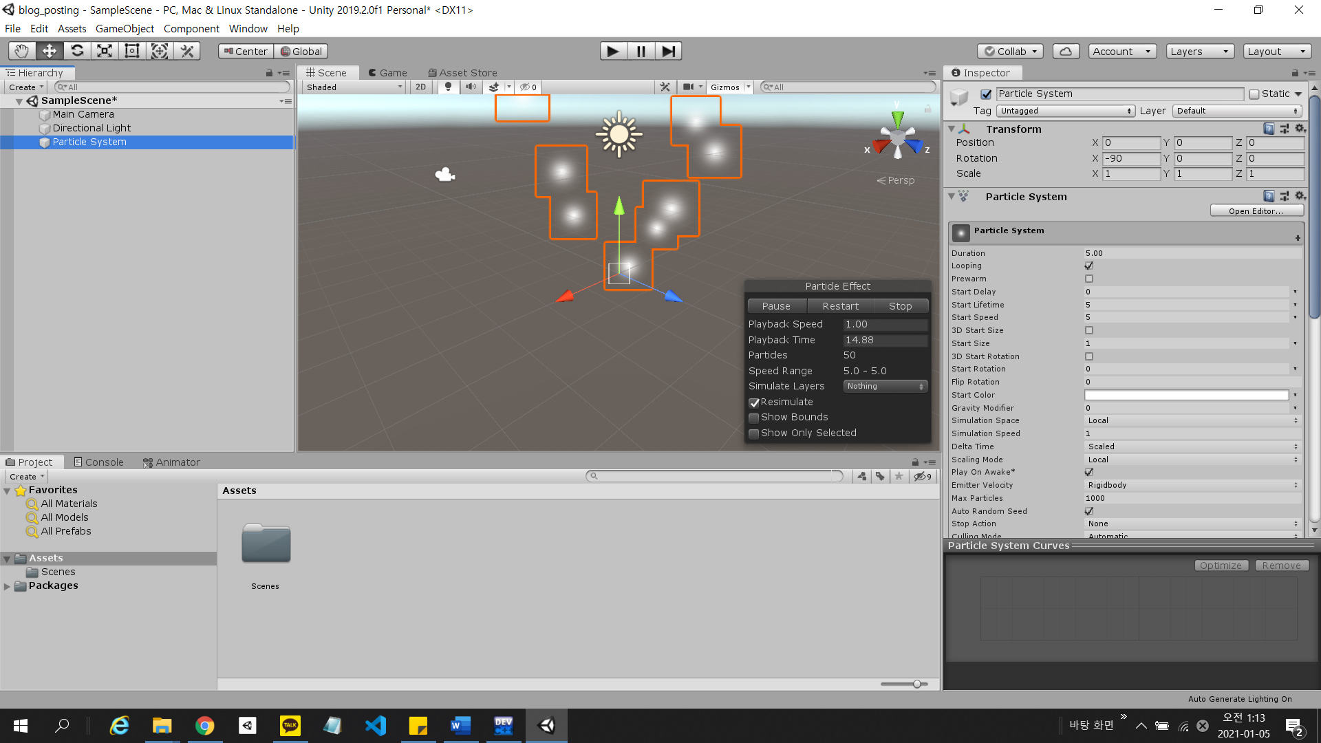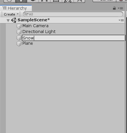 이제 이 particle system의 이름은 snow로 변경하고, 스크립트를 통해 날씨가 맑았다가(기본 상태) 흐려지는 걸 반복하는 것을 만들어보겠습니다.
