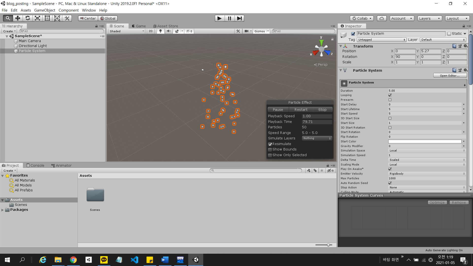 Hierarchy 창에서 오른쪽 마우스 클릭 - Effects - Particle System선택