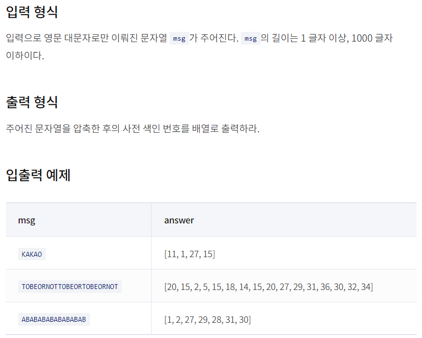 //dictionary 초기화. 대문자 : 아스키코드 65~90 for(i=65; i<=90; i++) { temp = (char)i; dictionary.insert(make_pair(temp, i-64)); } size = dictionary.size(); temp = "";1. dictionary 를 초기화하기