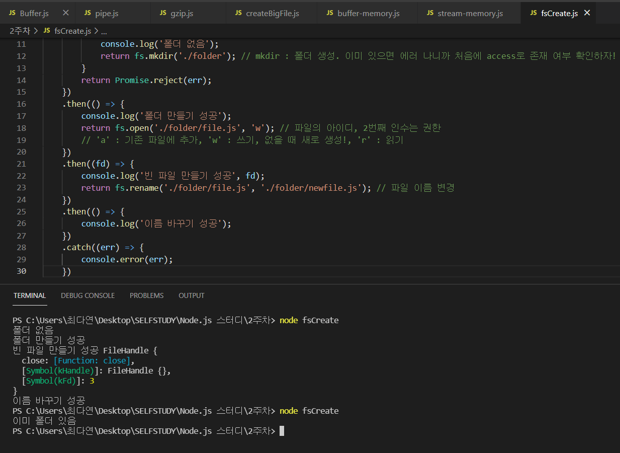 const fs = require('fs').promises; const constants = require('fs').constants; fs.access('./folder', constants.F_OK | constants.W_OK | constants.R_OK) // 폴더나 파일에 접근 가능한지 체크, F_OK : 존재 여부, W_OK : 쓰기 권한, R_OK : 읽기 권한 .then(() => { return Promise.reject('이미 폴더 있음'); }) .catch((err) => { if (err.code === 'ENOENT') { // 권한이 없을 경우의 에러코드 console.log('폴더 없음'); return fs.mkdir('./folder'); // mkdir : 폴더 생성. 이미 있으면 에러 나니까 처음에 access로 존재 여부 확인하자! } return Promise.reject(err); }) .then(() => { console.log('폴더 만들기 성공'); return fs.open('./folder/file.js', 'w'); // 파일의 아이디, 2번째 인수는 권한 // 'a' : 기존 파일에 추가, 'w' : 쓰기, 없을 때 새로 생성!, 'r' : 읽기 }) .then((fd) => { console.log('빈 파일 만들기 성공', fd); return fs.rename('./folder/file.js', './folder/newfile.js'); // 파일 이름 변경 }) .then(() => { console.log('이름 바꾸기 성공'); }) .catch((err) => { console.error(err); })처음 실행할 때는 폴더 생성 - 파일 생성 - 이름 바꾸기 순으로 간다.