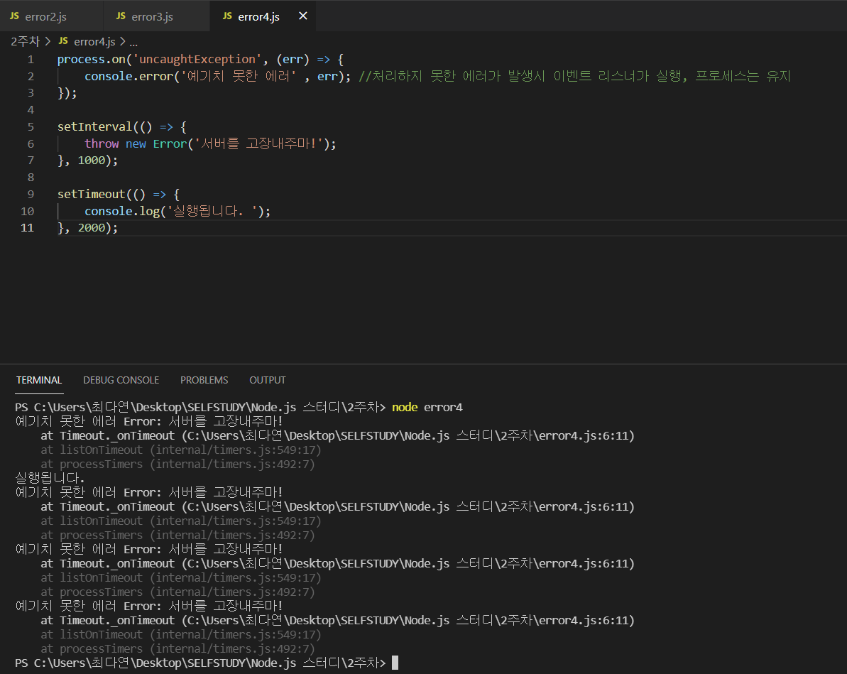 const fs = require('fs').promises; setInterval(() => { fs.unlink('./abcdefg.js') }, 1000);그 외 예측 불가능한 에러를 잡는 uncaughtException도 있다.