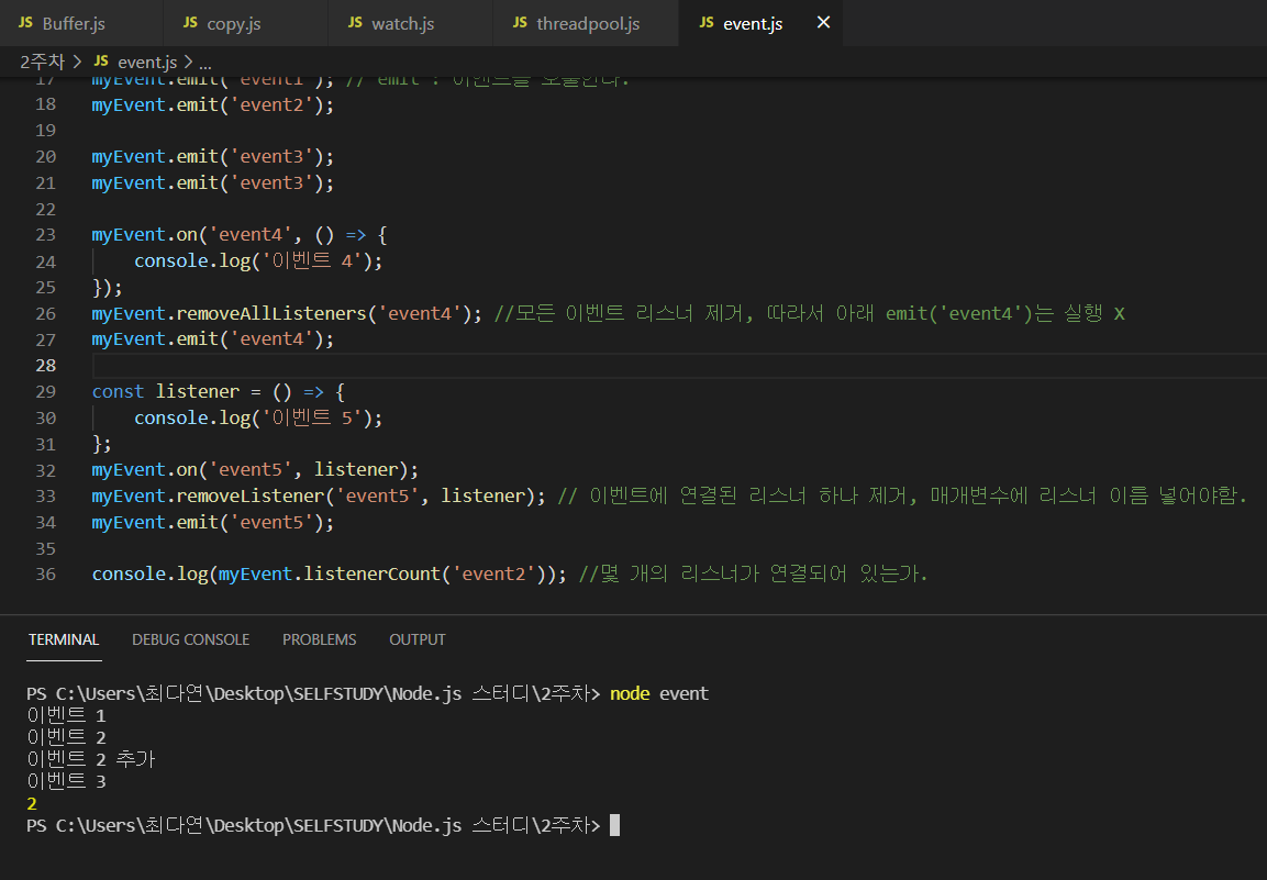 실행결과를 보면 이벤트 4와 이벤트 5는 emit되기 전 리스너가 remove되어서 실행이 안 된것을 확인할 수 있다.