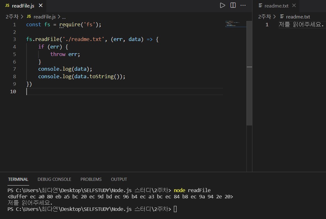 const fs = require('fs').promises; fs.readFile('./readme.txt') .then((data) => { console.log(data); console.log(data.toString()); }) .catch((err) => { console.log(err); })