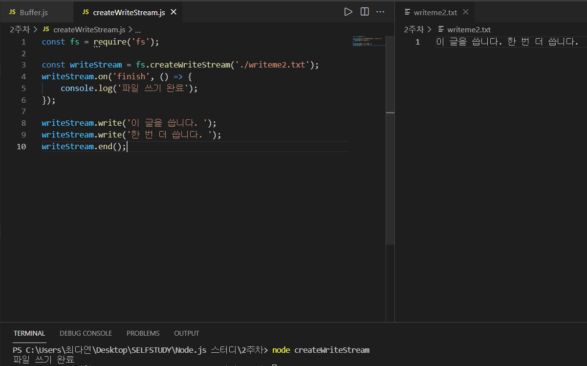 writeFile메서드의 인수에 파일 경로와 내용을 입력하면 writeme.txt파일이 만들어지면서 내용이 작성된다.