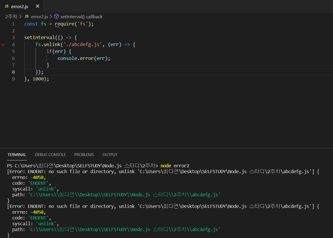 아래 코드는 존재하지 않는 파일을 지우려할 때 발생하는 에러를 노드 내에서 잡아주는 코드이다.