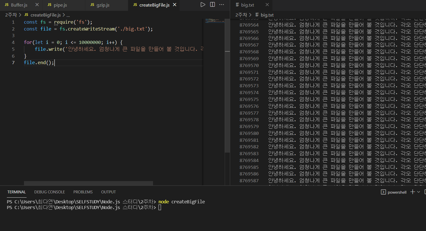 const fs = require('fs'); const file = fs.createWriteStream('./big.txt'); for(let i = 0; i <= 10000000; i++) { file.write('안녕하세요. 엄청나게 큰 파일을 만들어 볼 것입니다. 각오 단단히 하세요! \n'); } file.end();