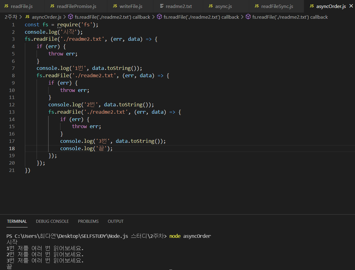 const fs = require('fs').promises; console.log('시작'); fs.readFile('./readme2.txt') .then((data) => { console.log('1번', data.toString()); return fs.readFile('./readme2.txt'); }) .then((data) => { console.log('2번', data.toString()); return fs.readFile('./readme2.txt'); }) .then((data) => { console.log('3번', data.toString()); console.log('끝'); }) .catch((err) => { console.error(err); });