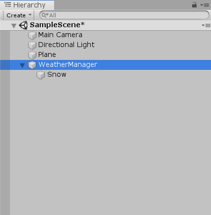 create Emtpy를 통해 빈 오브젝트 만들고 이름을 WeatherManager로 설정, Snow를 이안에 넣어주었습니다.