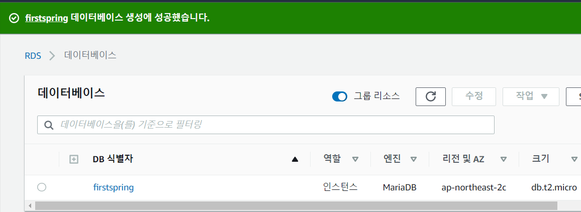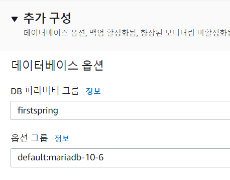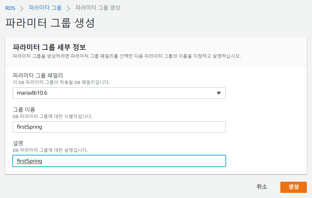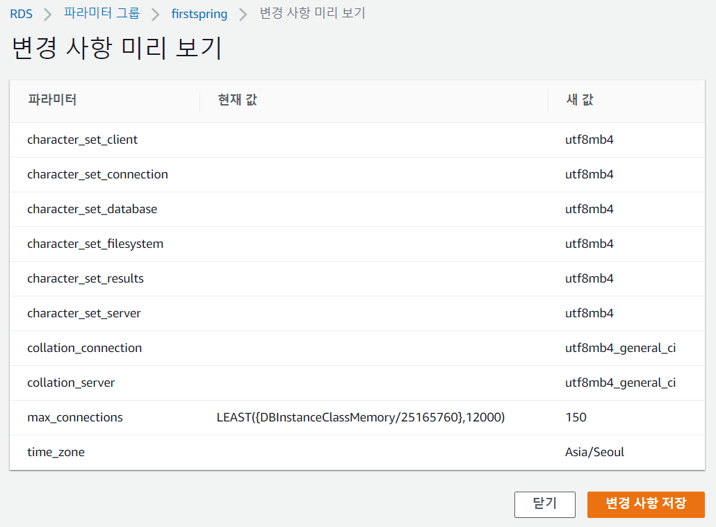 📌 처음에 RDS 생성할 때는 db파라미터 그룹이 default 값이었다. 이걸 방금 만든 파라미터 그룹으로 수정한다.