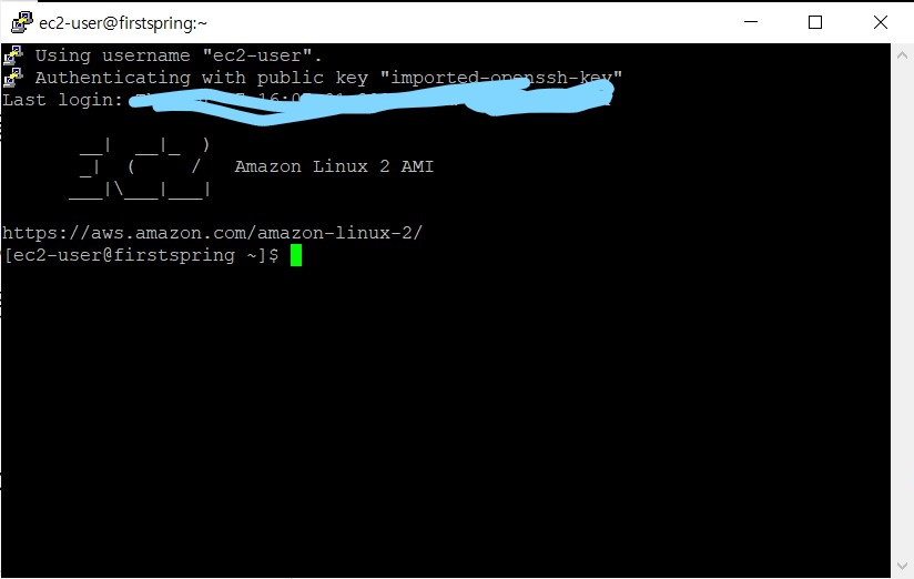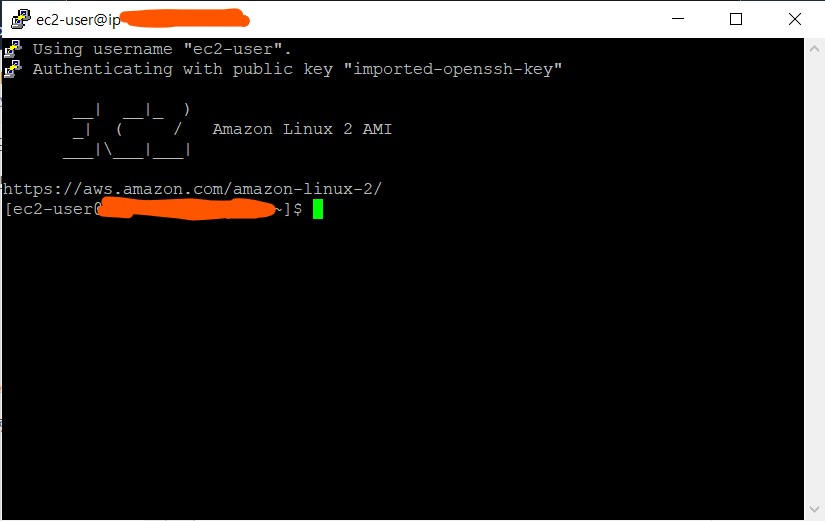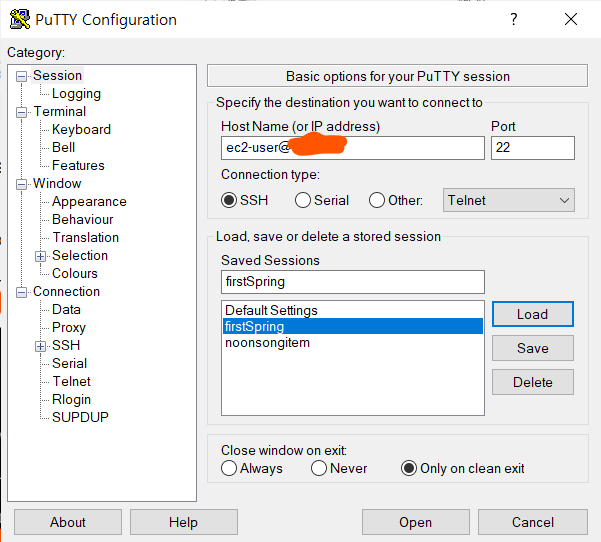 - putty 앱에서 hostname, ppk 파일(connection-ssh-auth 옵션에서 설정) 로드한 후 접속 시도