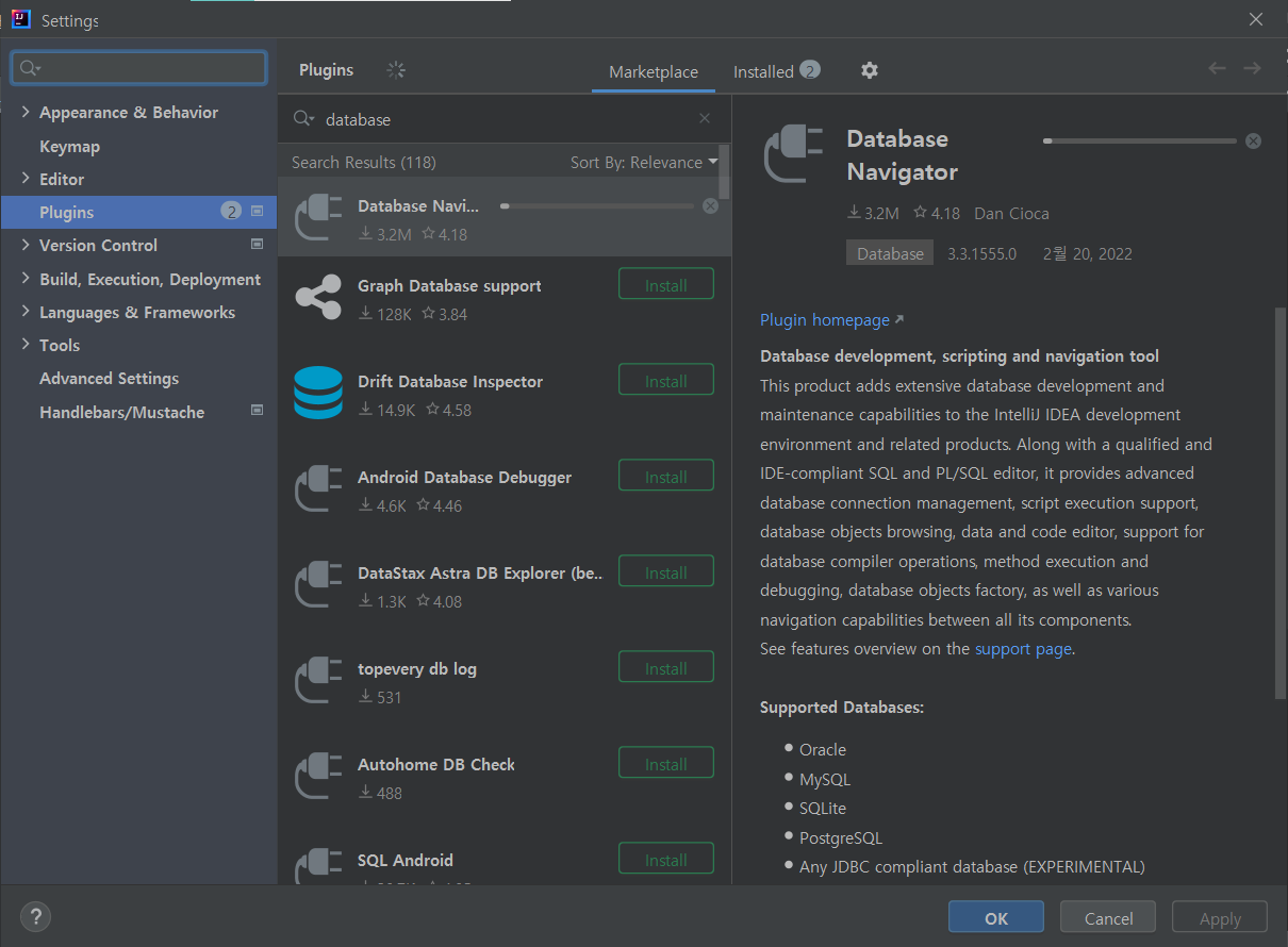 📌 INTELLIJ database navigator 플러그인 또한 설치.