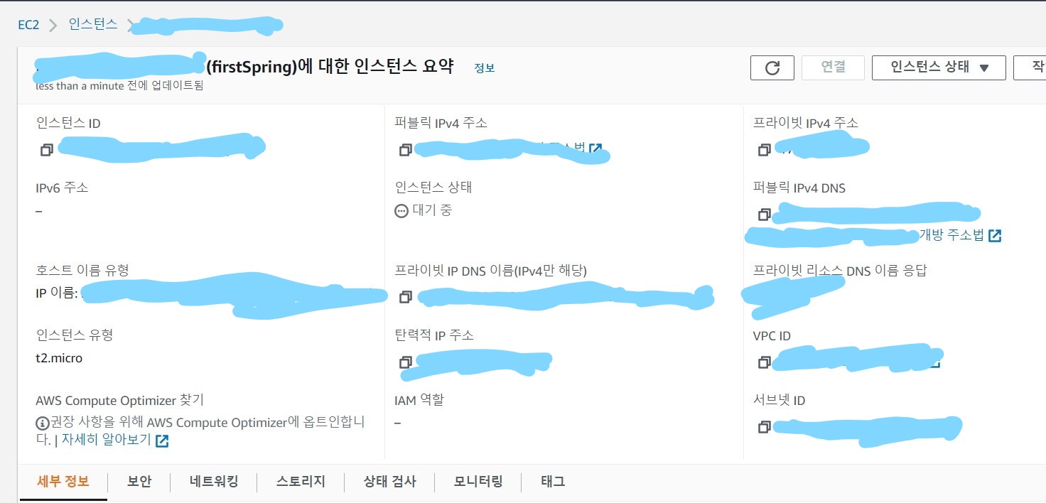 📌 탄력적 IP 설정 : 인스턴스를 중지하고 다시 시작하거나 할 때 매번 ip주소가 변경되지 않고 고정 ip를 가지게끔 만든다. 사실 프리티어 서비스는 24시간 계속 가동해놔도 750시간을 넘지 않아서 인스턴스를 중지하고 다시 시작하거나 이런 일이 없다보니 처음 할당해봤다.