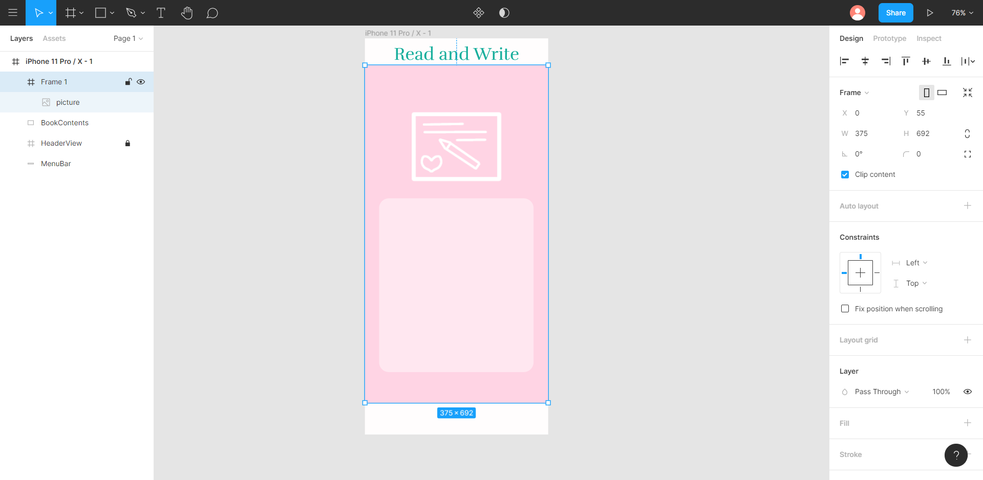 이렇게 view가 나타난다. 오른쪽 창을 보면 x, y값은 지금 만든 iphone 프레임의 위치를 나타내고, w랑 h는 크기!