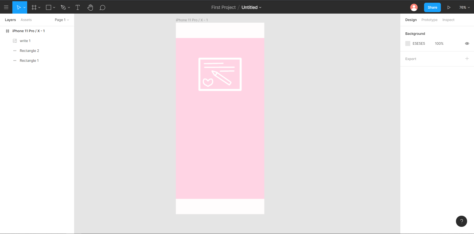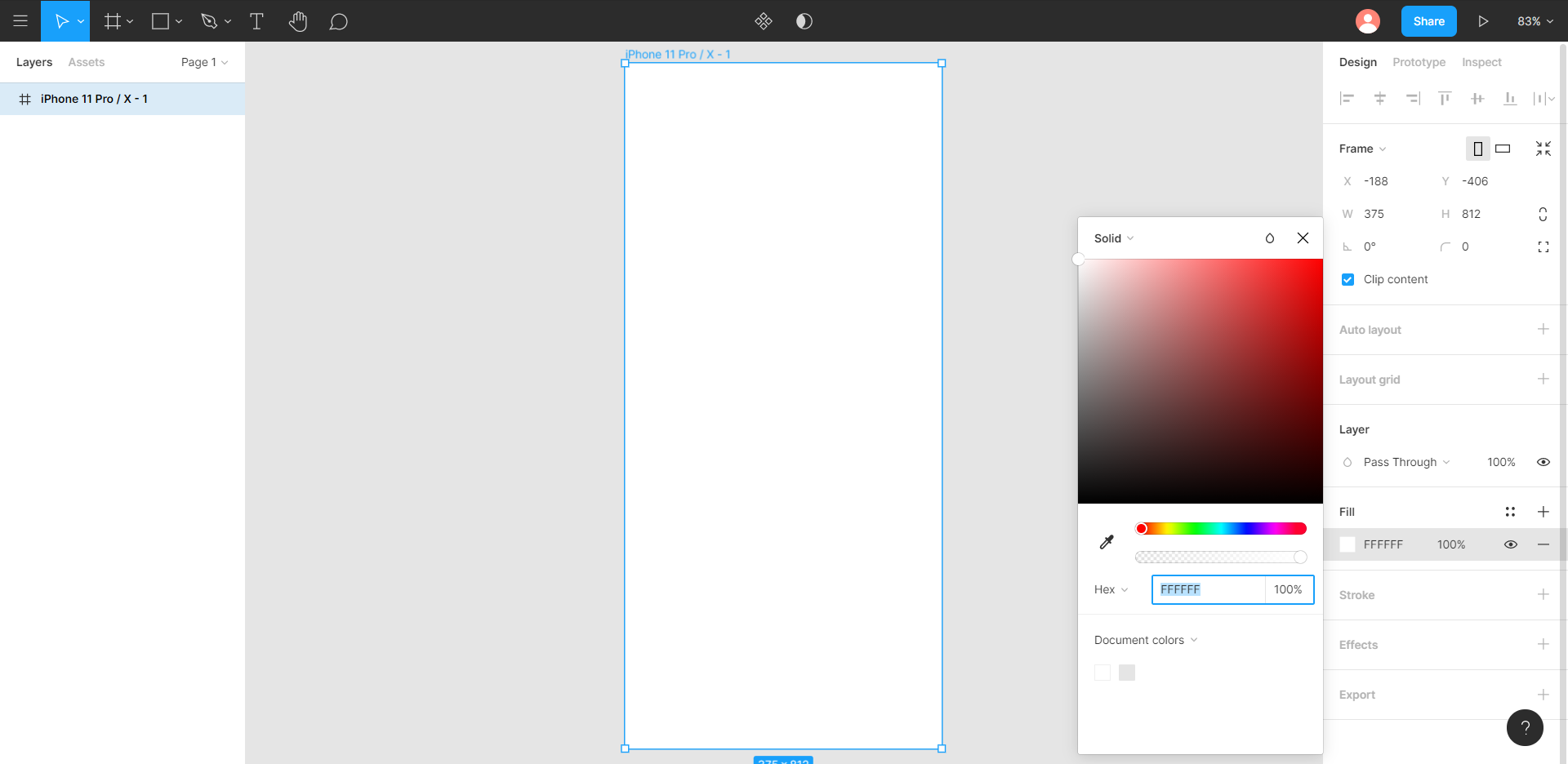 위치 원점으로 맞춰줘도 되고 이건 뭐 자율,,, (근데 이 페이지에 여러개의 프레임을 그릴거라면 원점으로 맞춰주는게 편할수도 있다) 그리고 오른쪽 더 아랫부분의 Fill을 누르면 위 사진처럼 색을 바꿀 수 있다. 나는 핑크색을 제일 좋아하니까 (tmi)핑크로 바꿔주었다.
