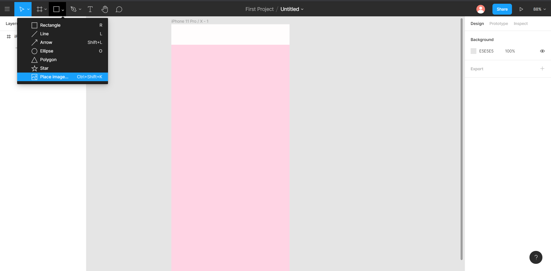 frame만들고 place image누르고! 순서는 상관없다. frame하위에 image가 들어가게끔 왼쪽에서 조절해주면 된다. 아이콘을 다 놨으면 마지막으로 언더 바 크기만큼의 frame을 만들어주고, 언더바 사각형, 저 아이콘이 소속된 프레임 3개를 다 넣어주면 된다.