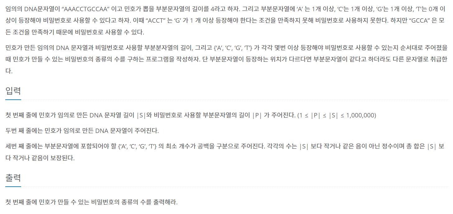 import java.util.*; import java.io.*; public class Main { static int checkArray[]; static int stateArray[]; // ACGT 순서 static int checkCondition; public static void main(String[] args) throws IOException { BufferedReader reader = new BufferedReader(new InputStreamReader(System.in)); StringTokenizer stringTokenizer= new StringTokenizer(reader.readLine()); int wholeLen = Integer.parseInt(stringTokenizer.nextToken()); // 전체 문자열 길이 int partLen = Integer.parseInt(stringTokenizer.nextToken()); // 부분 문자열 길이 int result = 0; checkCondition = 0; char charArray[] = new char[wholeLen]; // 전체 문자열 입력받을 배열 charArray = reader.readLine().toCharArray(); checkArray = new int[4]; // ACGT 각각 몇개 들어있어야 하는지 조건 저장 위한 배열 stateArray = new int[4]; // 지금 읽은 부분 문자열에 ACGT 몇개씩 들어있는지 상태 저장하기 위한 배열 stringTokenizer = new StringTokenizer(reader.readLine()); for (int i = 0; i < 4; i++) { checkArray[i] = Integer.parseInt(stringTokenizer.nextToken()); if (checkArray[i] == 0) { checkCondition++; // 만약 한 글자 아예 없어도 된다! 이 경우라면 condition 증가 } } for (int j = 0; j < partLen; j++) { readChar(charArray[j]); // 맨 처음 초기 partLen 만큼 먼저 읽어주고, 그 다음 한 칸씩 이동. } if (checkCondition == 4) { result++; // 처음 partLen만큼 읽었는데 만족한다면 일단 result 증가. } for (int i = partLen; i < wholeLen; i++) { int start = i - partLen; // 시작 부분, 이동하면서 맨 앞은 버리기 때문에 얘는 제거가 필요; readChar(charArray[i]); // partLen위치부터 한 칸씩 이동하면서 읽음, 이 반복문에서 i가 마지막 인덱스 removeChar(charArray[start]); if (checkCondition == 4) { result++; // 한 칸 이동할 때마다 checkCondition 만족하나 안하나 검사 } } System.out.println(result); reader.close(); } public static void readChar(char element) { switch(element) { case 'A' : stateArray[0]++; if (stateArray[0] == checkArray[0]) { checkCondition++; } break; case 'C' : stateArray[1]++; if (stateArray[1] == checkArray[1]) { checkCondition++; } break; case 'G' : stateArray[2]++; if (stateArray[2] == checkArray[2]) { checkCondition++; } break; case 'T' : stateArray[3]++; if (stateArray[3] == checkArray[3]) { checkCondition++; } break; } } public static void removeChar(char element) { switch(element) { case 'A' : if (stateArray[0] == checkArray[0]) { checkCondition--; // 현재까지의 상태가 문제 조건을 담은 배열과같을 경우에만 먼저 check조건 감소(읽으면서 증가시켰던것) } stateArray[0]--; // 그러고 나서 state 감소해야함..! 먼저 state감소시키면 정확하게 checkCondition 조정불가. break; case 'C' : if (stateArray[1] == checkArray[1]) { checkCondition--; } stateArray[1]--; break; case 'G' : if (stateArray[2] == checkArray[2]) { checkCondition--; } stateArray[2]--; break; case 'T' : if (stateArray[3] == checkArray[3]) { checkCondition--; } stateArray[3]--; break; } } }'Java > 코딩테스트' 카테고리의 다른 글
