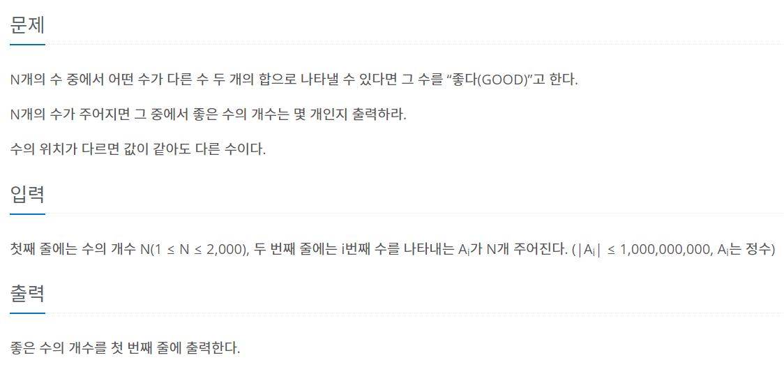 📌 자기 자신이 좋은 수에 포함되면 안 된다. 그래서 start와 end가 각각 i와 같은지 다른지 여부를 판단해야 한다. 이 부분 빼먹어서 실수했다.