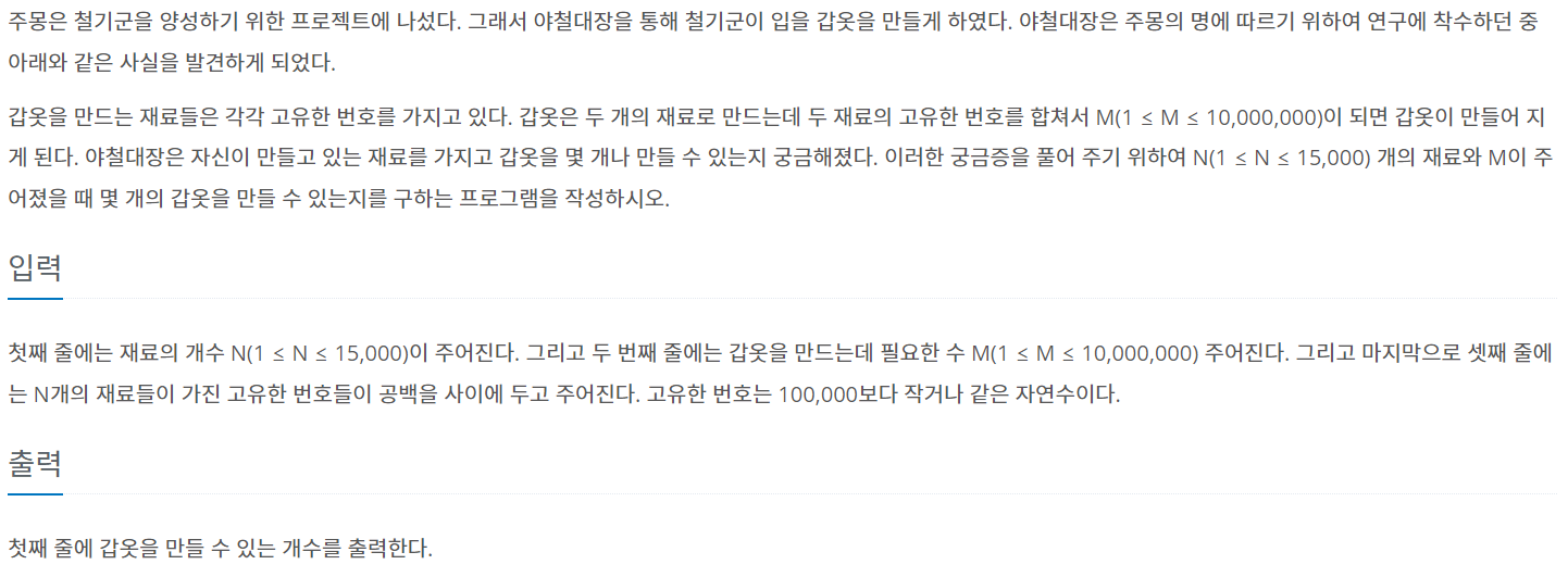 import java.util.*; import java.io.*; public class Main { public static void main(String[] args) throws IOException { BufferedReader br = new BufferedReader(new InputStreamReader(System.in)); int n = Integer.parseInt(br.readLine()); int m = Integer.parseInt(br.readLine()); // 엔터 기준으로 입력되기 때문에 바로 readLine후 parse int [] materials = new int[n]; StringTokenizer stringTokenizer = new StringTokenizer(br.readLine()); for (int i = 0; i < n; i++) { materials[i] = Integer.parseInt(stringTokenizer.nextToken()); } Arrays.sort(materials); // 배열 정렬 int start = 0; int end = n-1; int count = 0; while (start < end) { if (materials[start] + materials[end] > m) { end--; } else if (materials[start] + materials[end] < m) { start++; } else { count++; start++; end--; } } System.out.println(count); } }