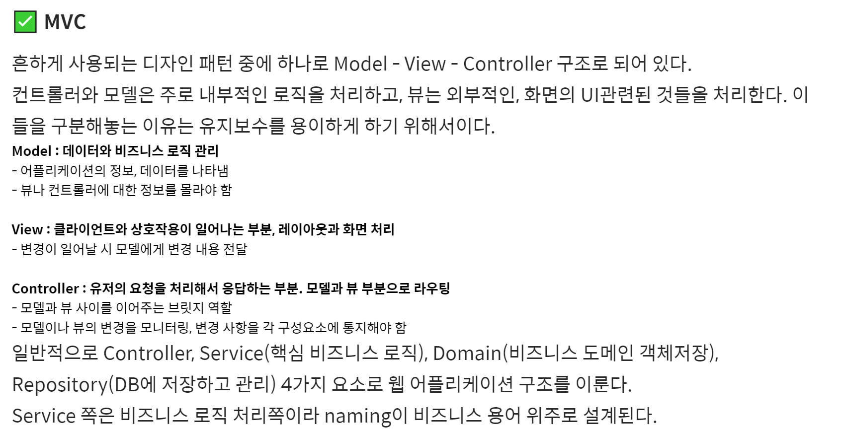 - 위에 적혀있듯 Controller는 요청을 받는 측, Service가 비즈니스 로직들 처리, Repository가 내부 로직 처리