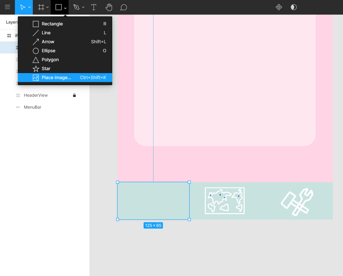 frame만들고 place image누르고! 순서는 상관없다. frame하위에 image가 들어가게끔 왼쪽에서 조절해주면 된다. 아이콘을 다 놨으면 마지막으로 언더 바 크기만큼의 frame을 만들어주고, 언더바 사각형, 저 아이콘이 소속된 프레임 3개를 다 넣어주면 된다.
