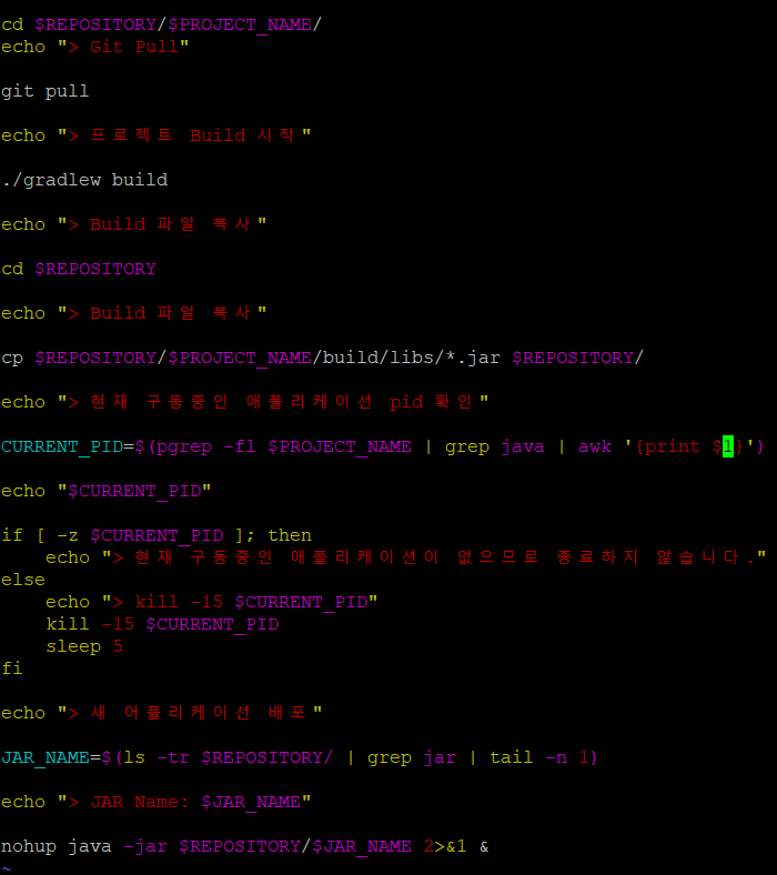 사실 저기 CURRENT_PID에 해당하는 명령어를 쳤을 때 제대로 안 나오는 듯 해서 그냥 deploy.sh 실행 전에 위에 써있는 8080 포트 먼저 kill하면 별 일 없이 잘 돌아간다. 내 추측이지만, 저 CURRENT_PID 부분에 위 명령어 넣는게 더 나을 수도 있을 것 같다. 렉 현상 때문...
