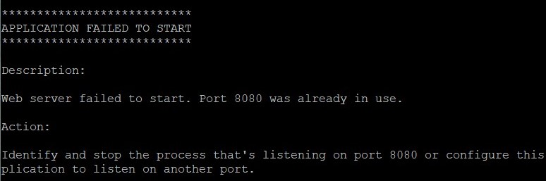 Web server failed to start. Port 8080 was already in use. Action: Identify and stop the process that's listening on port 8080 or configure this application to listen on another port.