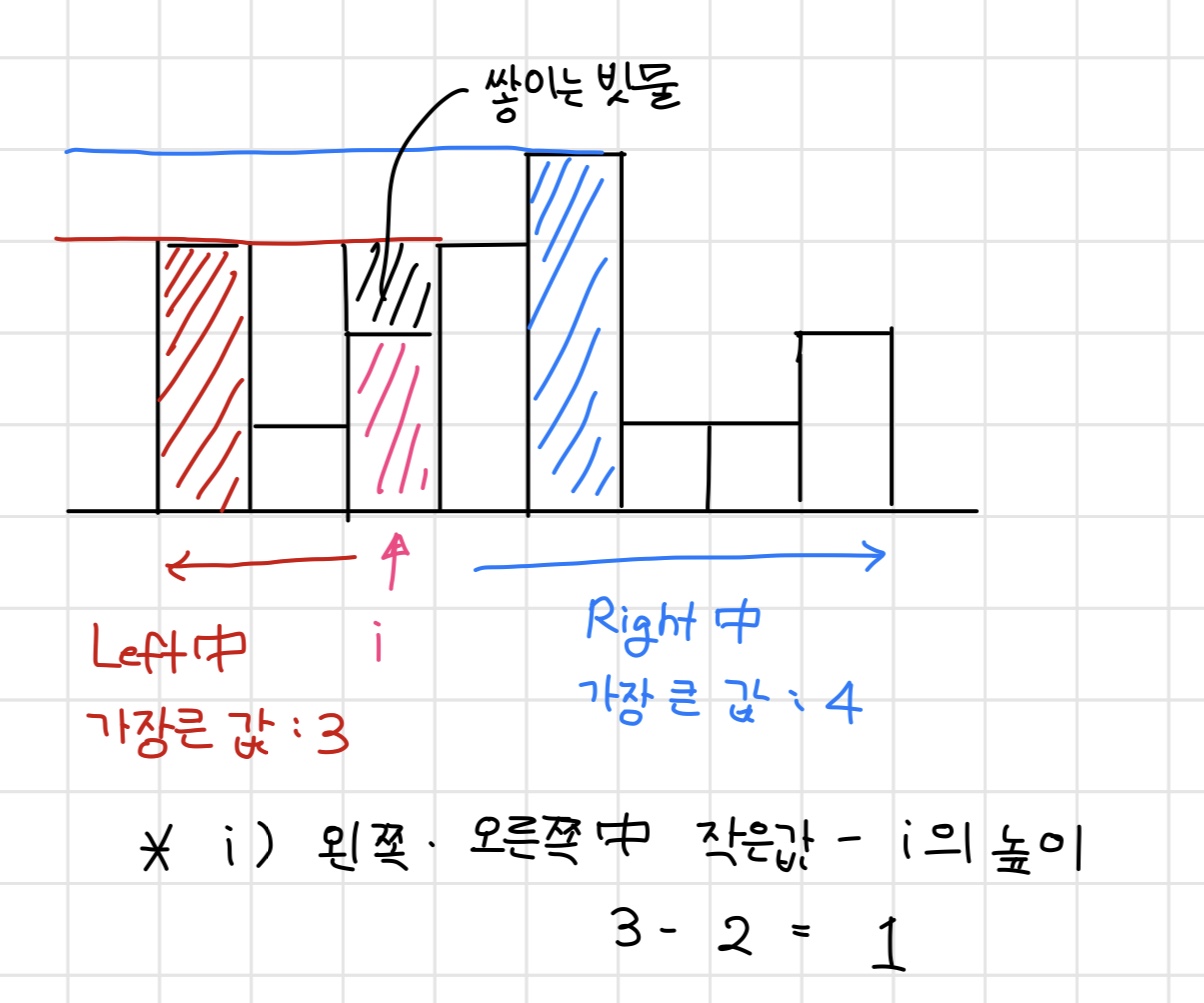 - 왼쪽의 max, 오른쪽의 max 비교 후 둘 중 더 작은 값에서 index의 높이를 빼준 것이 고이는 빗물 양