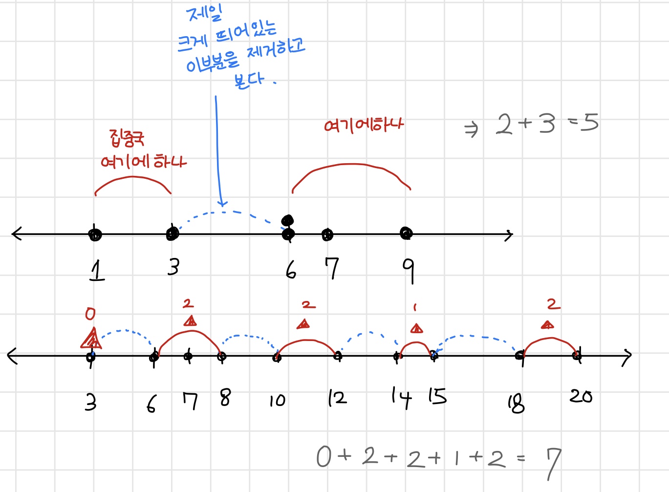 그리고 이 센서간 차이들 중 가장 큰것부터 (센서 개수 - 1 )만큼 제거하면 된다. 그림이 좀 더 이해가 쉽다.