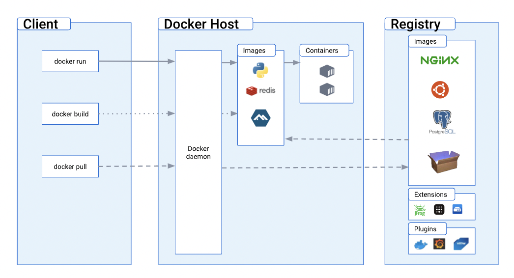 - docker pull, docker run 명령어 사용하여 registry로부터 이미지 가져오거나 docker push 통해 이미지를 registry에 올릴 수도 있음
