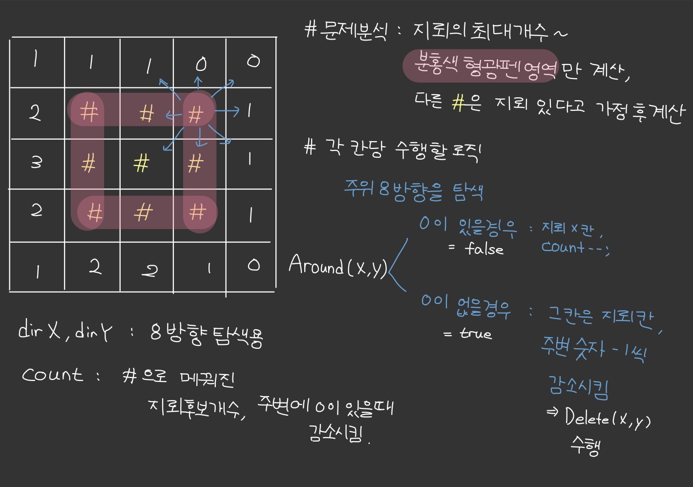 💣 그리디, 구현 문제로 분류되어 있다. 아래 그림의 분홍 형광펜 영역 기준 8방향을 탐색하는 Around함수, 그리고 Around 결과 따라 count를 감소시킬지 / 주변 숫자를 1씩 감소시킬지를 결정한다.