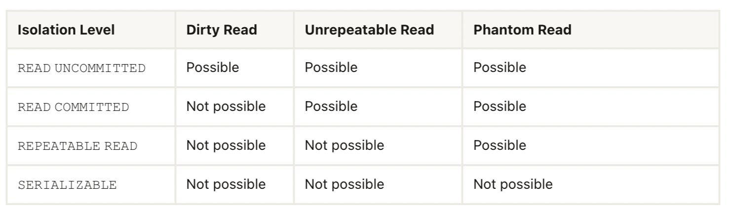 아래 이미지는 오라클 문서에서 정의한 격리 수준에 따라 발생하는 문제들의 가능성 여부이다.