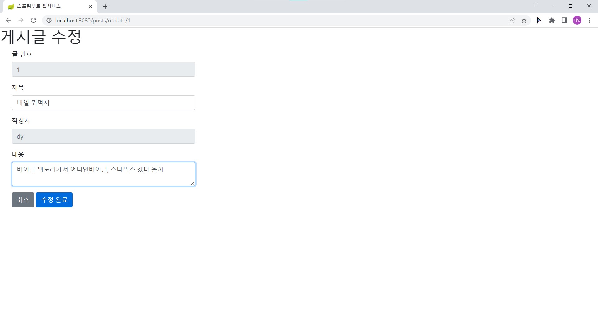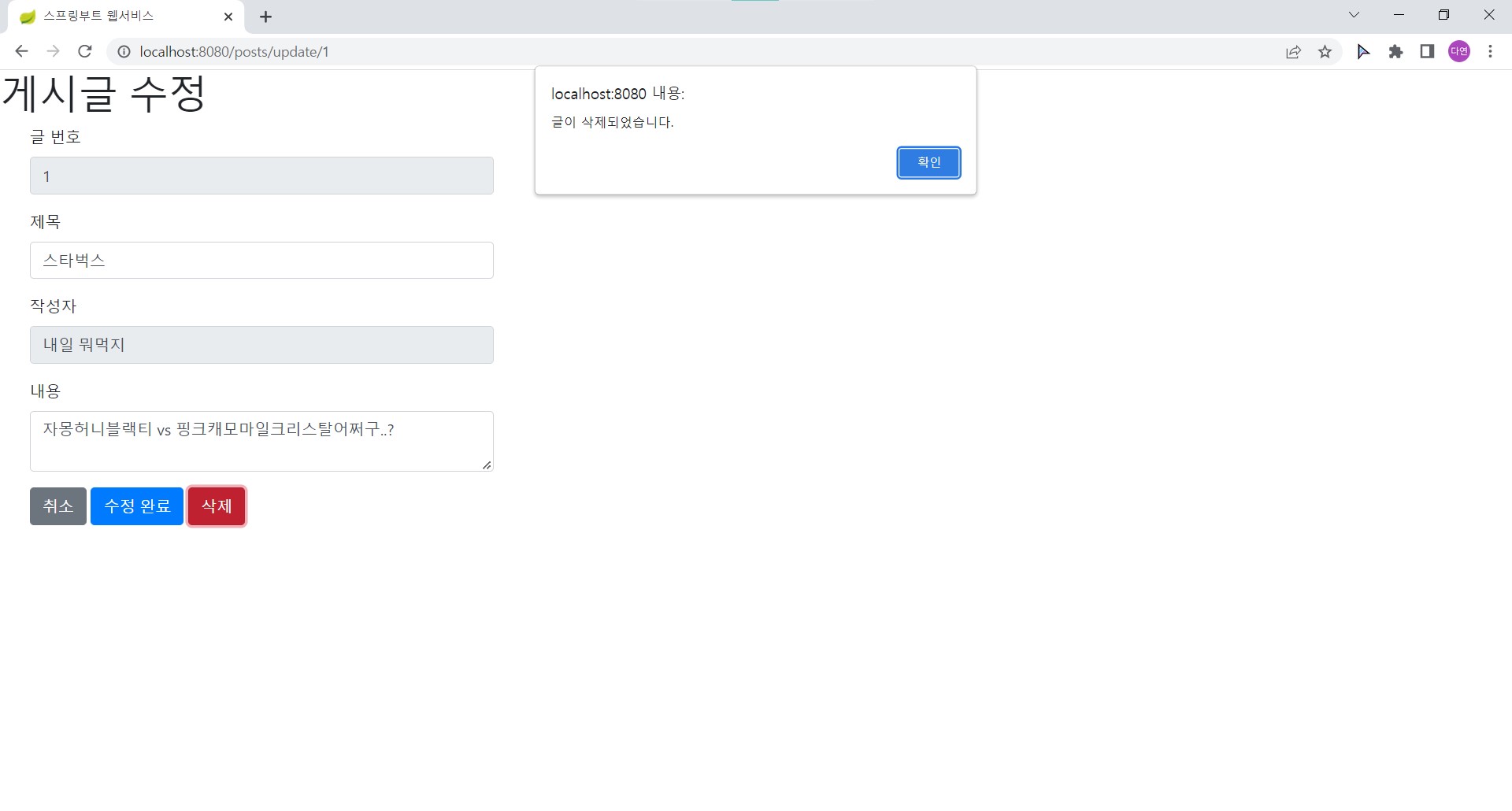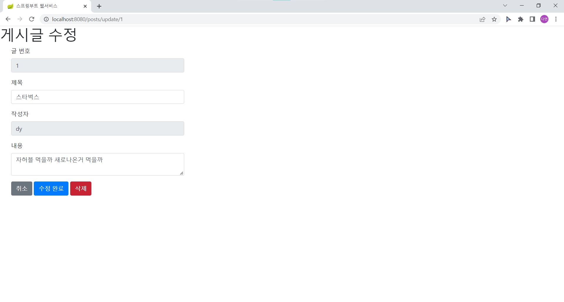 마지막으로, 만들어 두었던 게시글 수정 API를 위한 화면 개발, 삭제 화면 및 삭제 API를 작성하면 기본 기능 구현이 끝난다.