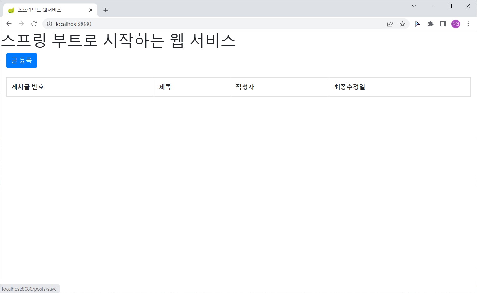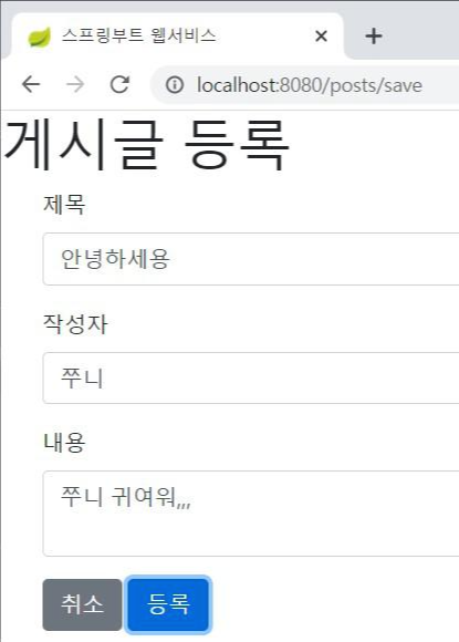 return "posts-save"; // posts/save 호출하면 posts-save.mustache 호출하는 메소드 추가