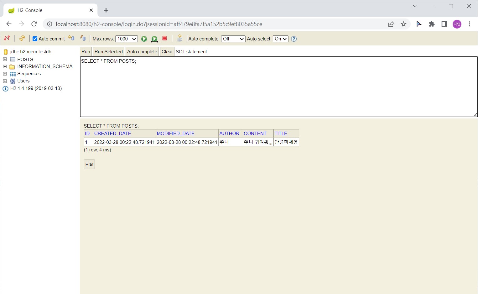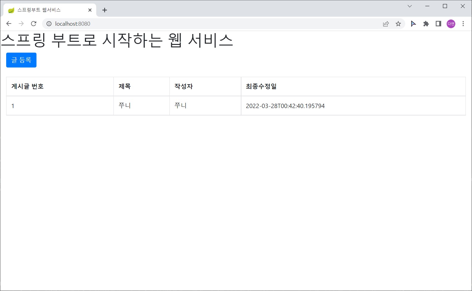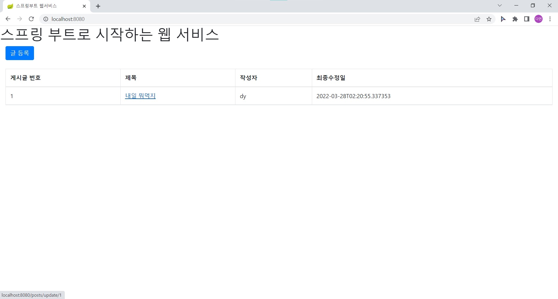 여기까지 코드를 완성하면 글 작성, 글 목록 2가지 기능이 구현되어 있다.